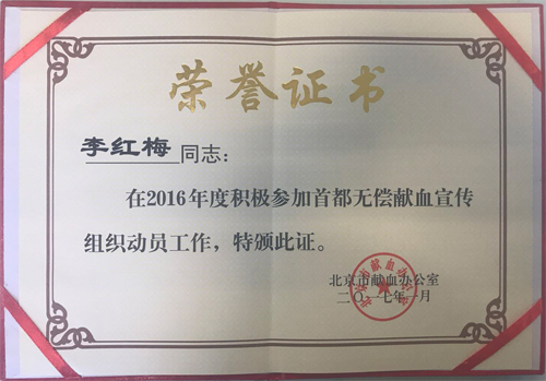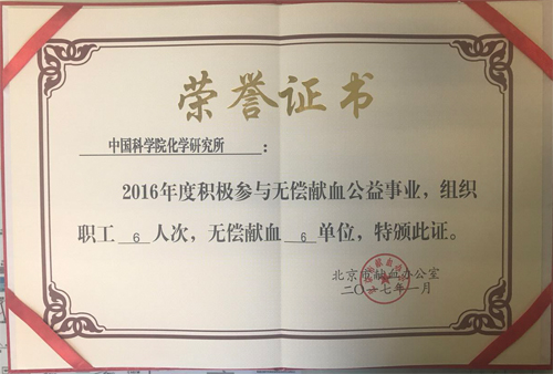 2016年,由于在积极动员单位职工参加无偿献血应急志愿者队伍及无偿献血工作中表现突出,化学所被评为北京市海淀区2016年度无偿献血工作先进单位。李红梅同志被评为先进个人。