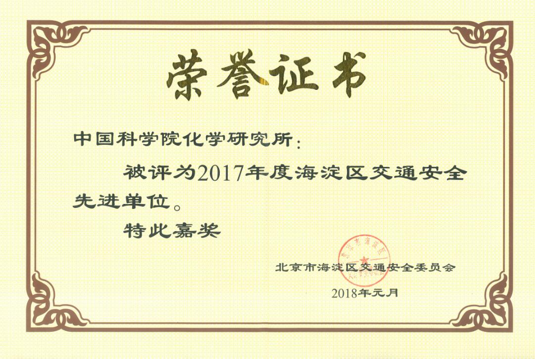 2017年度,由于在交通安全工作方面表现突出,化学所被评为海淀区交通安全先进单位。
