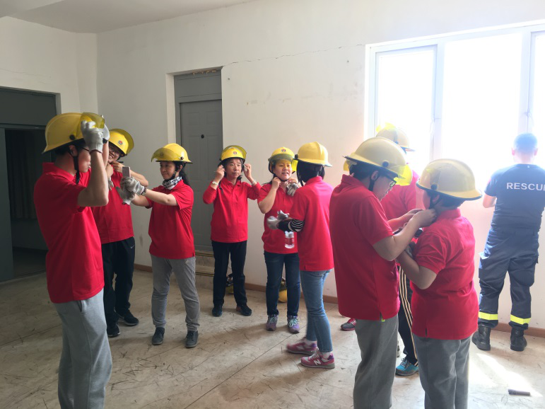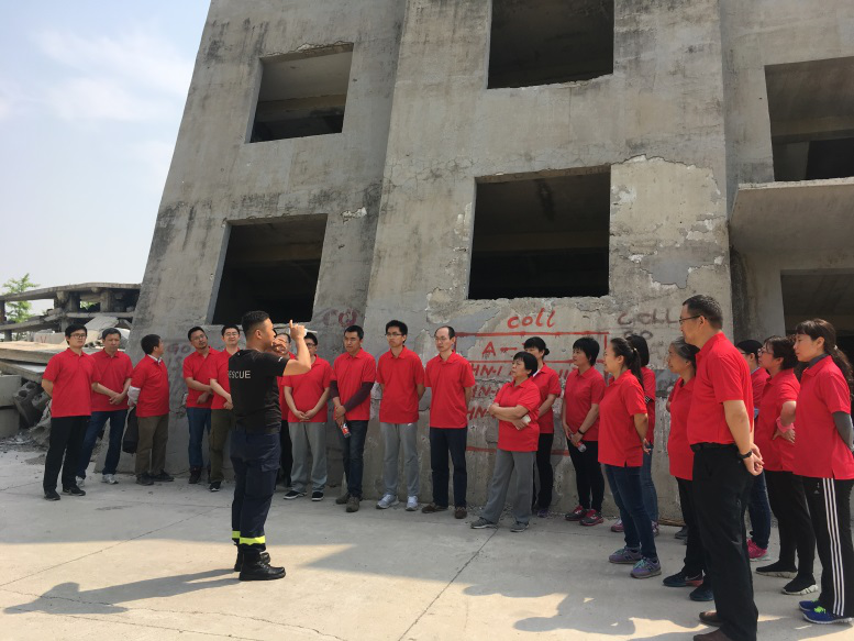 按照培训计划,47名参训队员分成两个小组分别体验了基地内综合场(斜楼基地废墟)训练、烟道逃生、打绳结、高空绳索逃生、地震救援装备的使用等理论知识和实际操作。在亲身体验过程中,大家相互帮助、齐心协力,克服了在黑暗、浓烟、高空、眩晕、紧张等不同环境下的种种困难,在教官的指导下顺利完成各项培训项目。在参观“托起生命的希望”中国地震救援荣誉室时,陈列的张张照片默默地记录着中国救援队员在世界各地、各种灾难中的真实写照,教官充满深情的讲解,使每一个人都浸湿了眼眶,对中国救援队的官兵充满敬意;观看的4D地震灾难宣传教育片,让大家了解突发事件来临时不惊慌,一定要沉着应对。