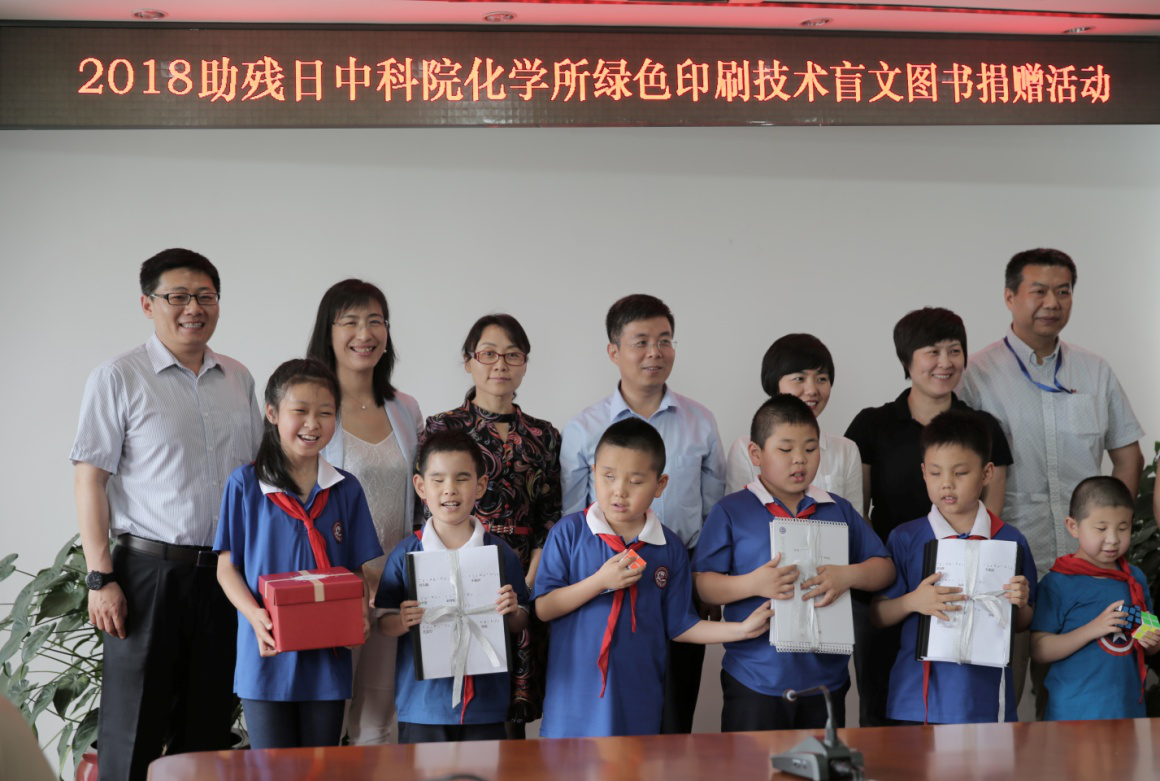自1990年起,我国将每年五月的第三个星期日定为全国助残日。盲人作为一个特殊的群体,学习、工作和生活都有诸多不便。2018年5月17日下午,在全国助残日即将到来之际,化学所绿色印刷实验室盲文印制研发团队来到北京市盲人学校进行捐赠活动。盲人教育专家、北京盲人学校陈瑜副校长和教务主任韩斌,化学所绿色印刷实验室主任宋延林、党办副主任李丹、绿色印刷实验室盲文印制研发团队负责人贾志梅等参加捐赠活动。