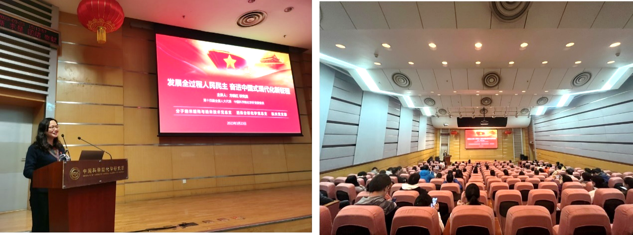 会议还邀请第十四届全国人大代表、所党委委员方晓红研究员为分子纳米结构与纳米技术党总支、活体分析党总支与机关党支部的党员同志上了一堂题为“发展全过程人民民主,奋进中国式现代化新征程”的党课。郭玉国同志感谢方老师为大家介绍了两会精神的核心内容,让大家对中国式现代化新征程充满信心。作为科技工作者,要肩负起历史责任,事不畏难、行不避艰,为提高国家科技创新能力贡献力量。