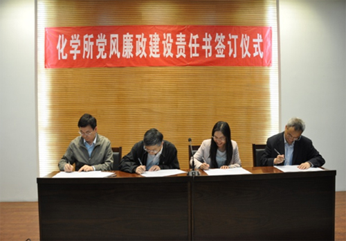 随后进行了党风廉政建设责任书的签订仪式,张德清所长和王笃金书记分别与副所长、各研究单元、各职能部门和各党支部签订了党风廉政建设责任书。纪委书记杨国强作了“廉洁从业,做好化学所党风廉政工作”专题报告,传达了院党风廉政建设工作会议的精神,包括中纪委驻院纪检组组长李志刚同志的工作报告和白春礼院长的总结和要求;介绍了化学所近期有关廉洁从业和风险防控工作的情况;强调全所广大职工和研究生,特别是党员干部要从“小处”着手,从“小事”做起,树立“廉洁从业、风险防控”的意识,促进化学所的党风廉政建设,为保证化学所的科研工作正常稳定的发展做出贡献。