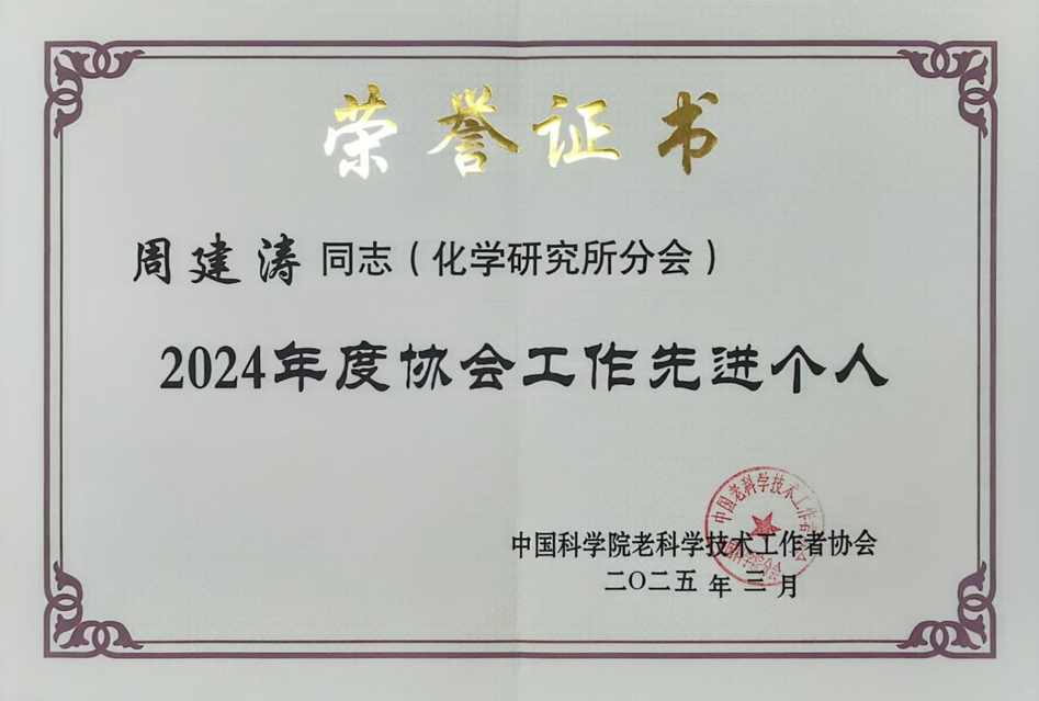 化学所荣获“2024年度协会工作先进集体”和“2024 年度学术沙龙工作优秀奖” 两项殊荣,周建涛同志被评为“2024 年度协会工作先进个人”。