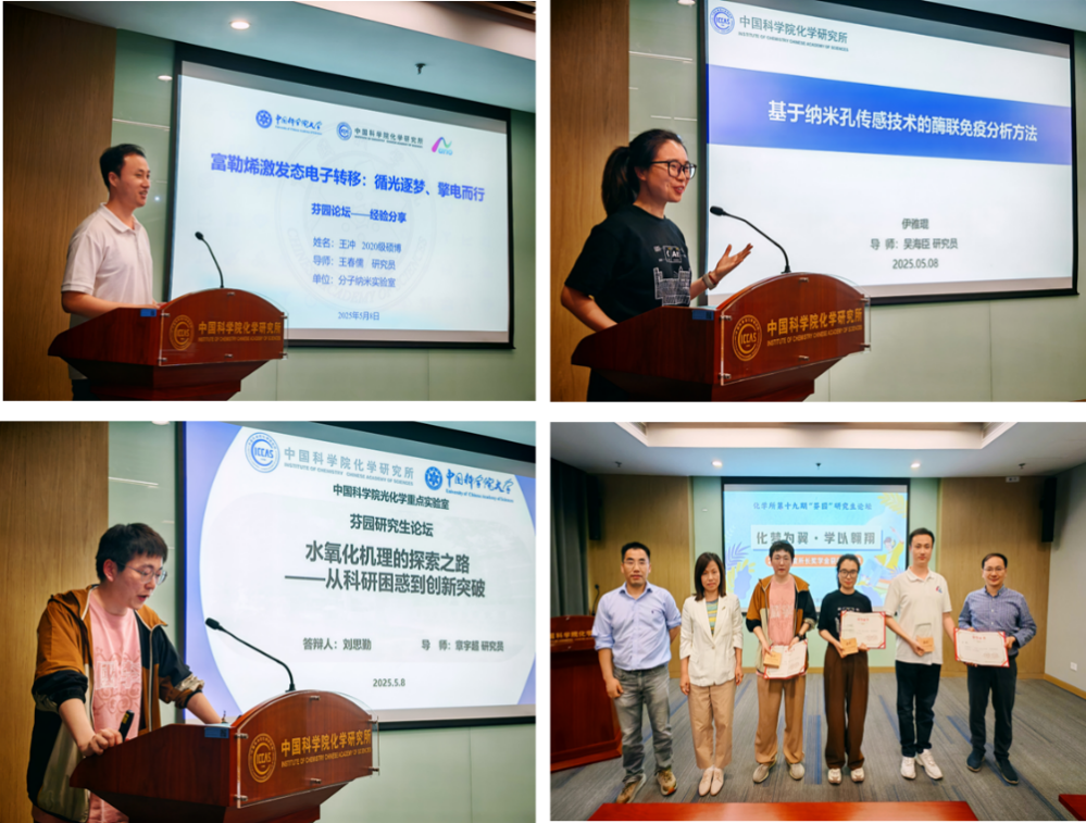 2025年5月8日,以“化梦为翼·学以翱翔”为主题的第十九期“芬园”研究生论坛在3号楼310会议室举办。论坛特邀荣获2024年度化学所所长奖学金的王冲、伊雅琨和刘思勤三位优秀研究生代表作专题分享,胶体界面与化学热力学实验室张建玲研究员、分子纳米结构与纳米技术实验室曹安民研究员、活体分析化学实验室汪铭研究员、教育处相关老师以及近百名研究生共同参与。