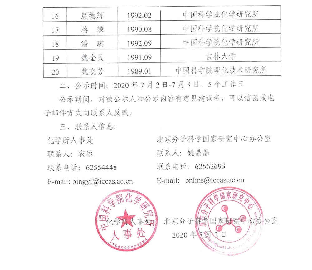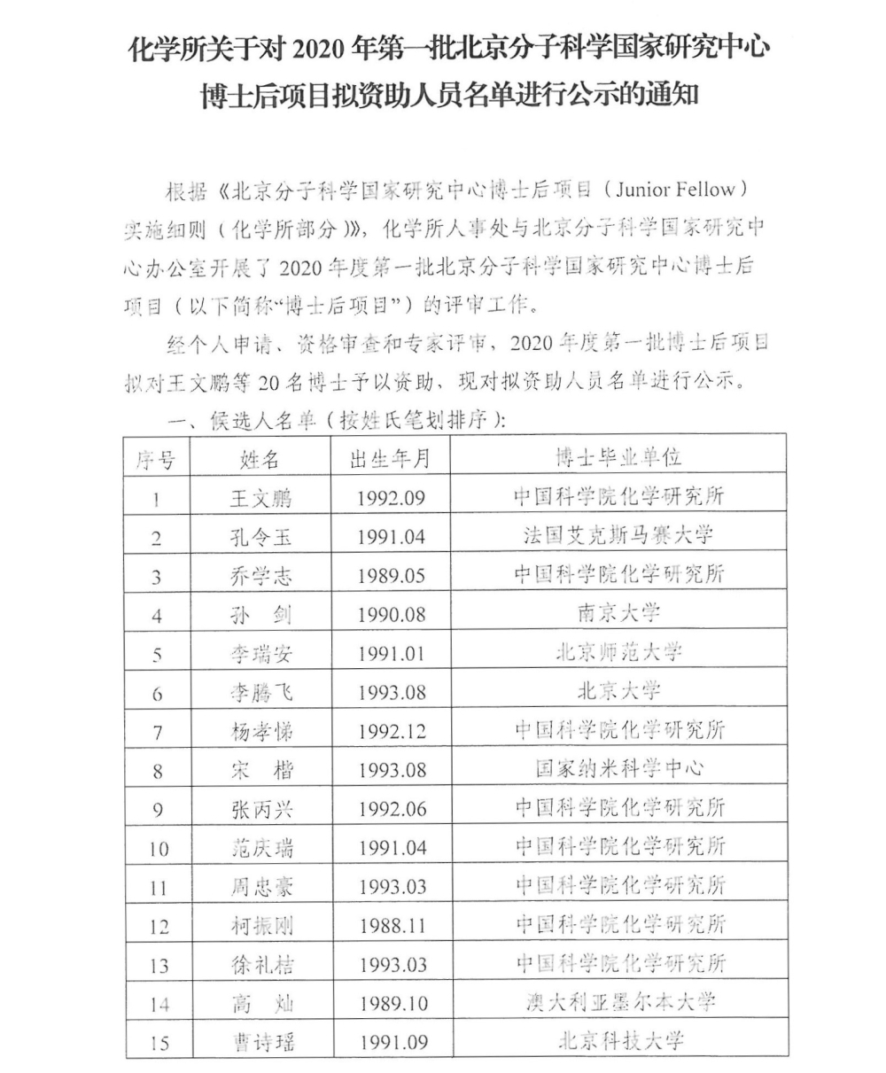 化学所关于对2020年第一批国家研究中心博士后项目拟资助人员名单进行公示的通知