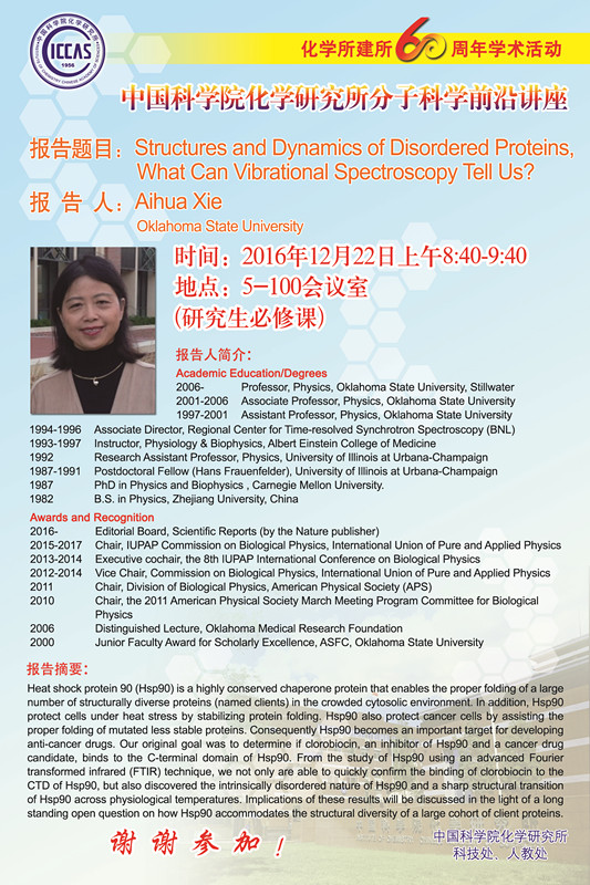 俄克拉荷马州立大学Aihua Xie教授拟于2016年12月22日作分子科学前沿讲座
