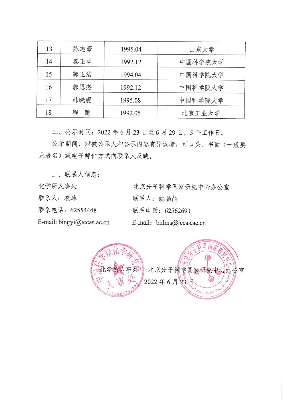 化学所关于对2022年第一批国家研究中心博士后项目拟资助人员进行公示的通知