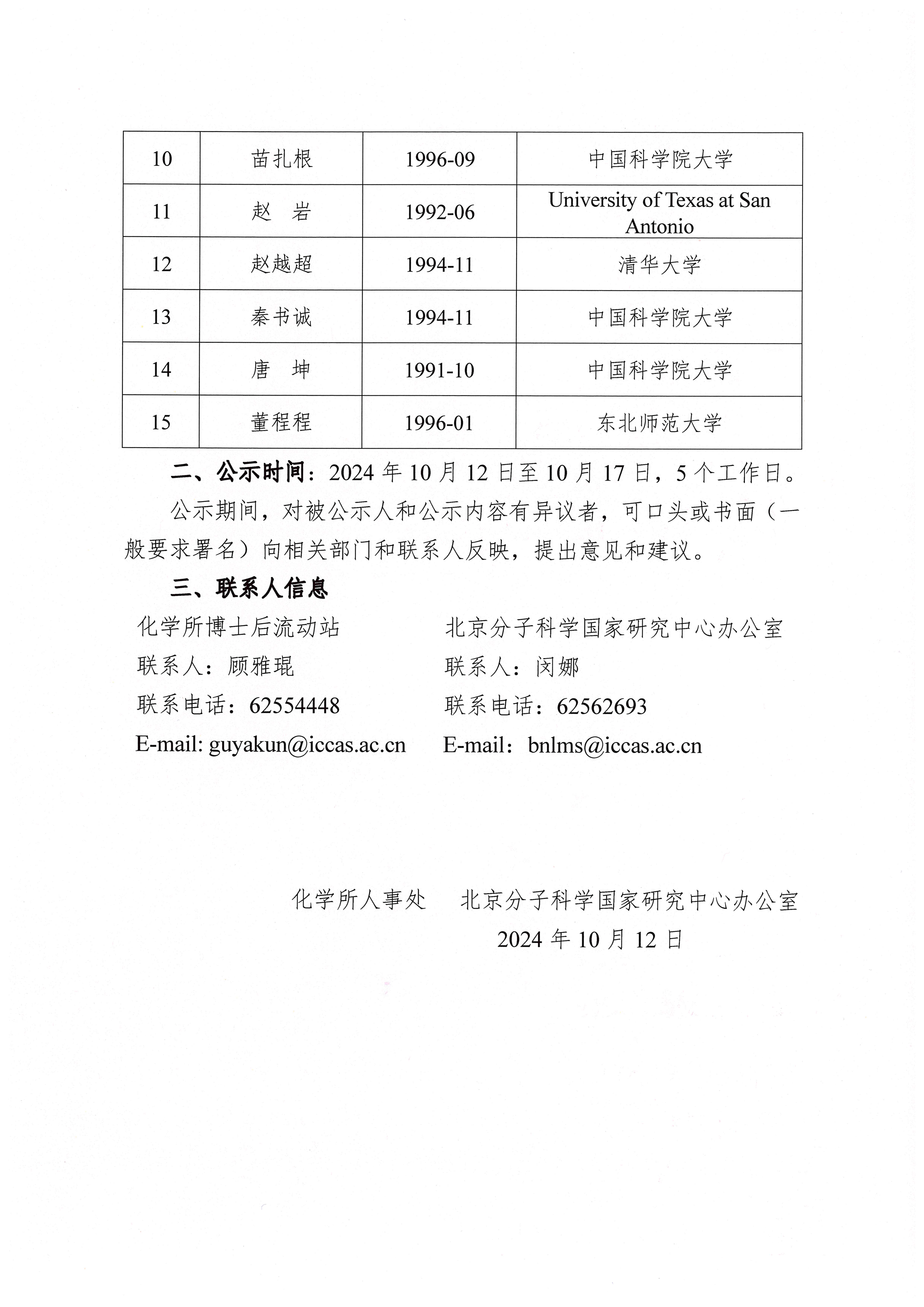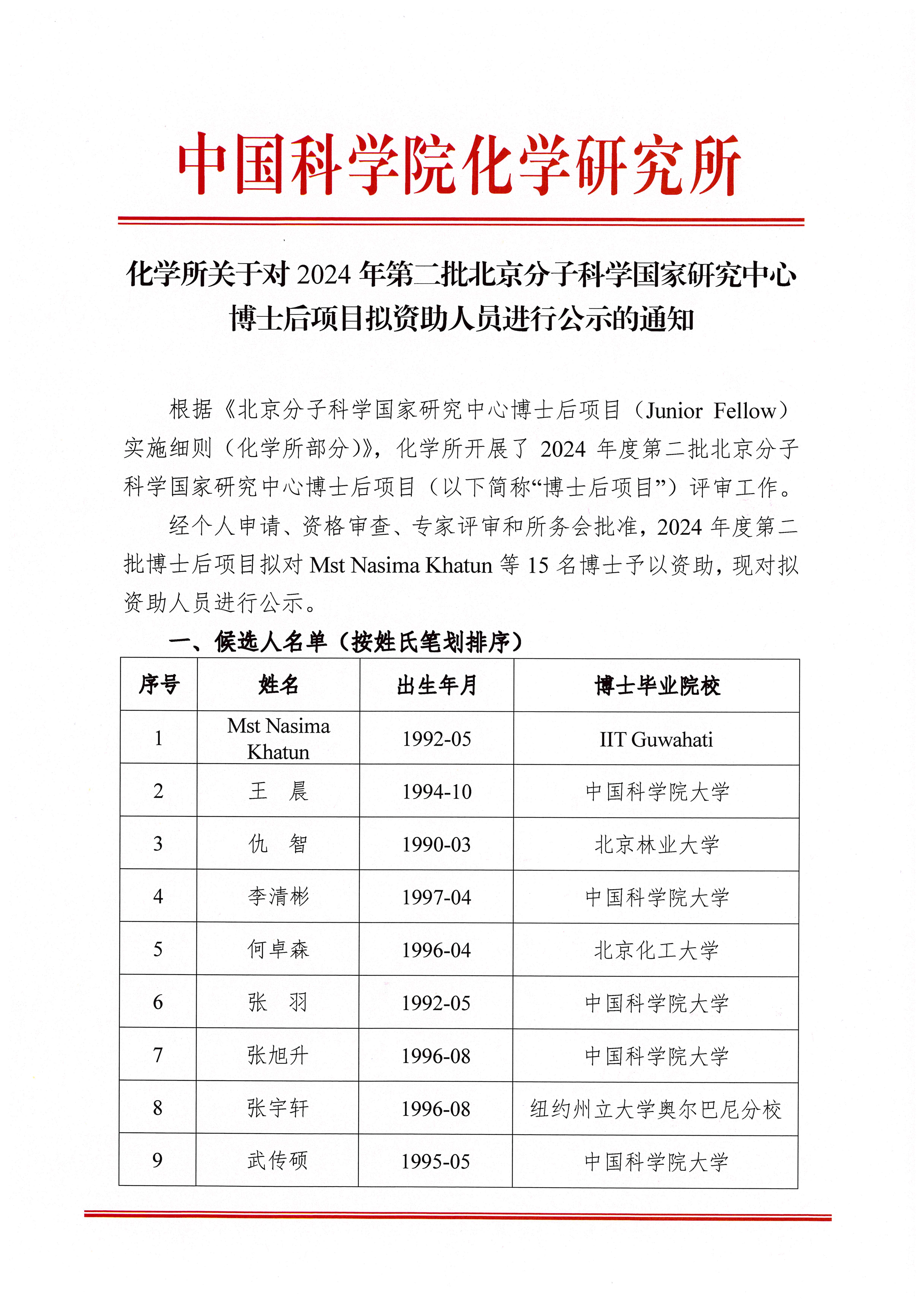 化学所关于对2024年第二批北京分子科学国家研究中心博士后项目拟资助人员进行公示的通知