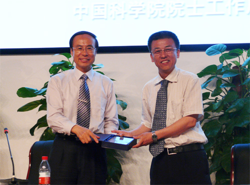 中科院院士工作局副局长刘峰松向万立骏院士赠送“科学讲坛”纪念牌