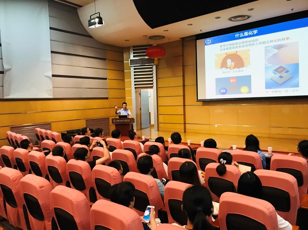 报告开始前,姚立研究员首先带领大家观看了化学所的宣传片,使他们初步了解化学所。接着,他为大家做了题为“一流的化学研究平台,一流的人才培养基地”的科普报告,用通俗易懂的语言,激情饱满、声情并茂的阐释了什么是化学,介绍了生活中可以接触到的化学现象以及伟大化学家的故事,引导大家走进神奇的化学世界。随后,姚立向大家介绍了化学所的建立、发展、组织机构、研究生招生和学习等情况,并着重介绍了分子动态和稳态实验室、分子反应动力学实验室各个课题组的研究方向和内容,为大家在进入实验室参观前留下初步印象。报告结束后,姚立用幽默的语言分享了个人观点并与学生们进行了深入讨论,鼓励学生们从兴趣出发学以致用,多做实验,在理解的基础上记忆,在记忆的基础上运用,并带着批判的观点学习化学。