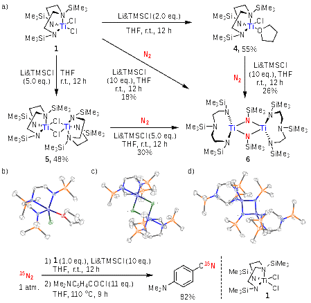 基于这一原则,我们设计了由中心金属钛(Ti)介导的金属配合物体系。其中氮原子作为和金属键合的节点,不同氮原子间以烷基链相连,末端的氮原子连接了体积较大的三甲基硅基,使得钛的周围被严密保护。接着,我们使用强还原性的石墨钾对该物种进行还原,使得氯离子脱落,低价钛中心得以暴露。因为该金属中心的高活性,氮气的结合迅速发生,得到两端均由钛配位的氮气络合物。电子被钛物种顺利转移给了氮气,导致其带一定的负电荷,进而对体系中的带正电荷的钾离子有吸引作用,在晶体中形成紧密的团簇结构。有趣的是,如果我们在这个时候打破“口袋”,氮气不仅没有脱落,反而可以进行完全的裂解,并可在后续的转化中被其他有机物种捕获,获得酰亚胺类化合物,完成了自然界从未实现过的由氮气直接合成含氮有机物的过程。
