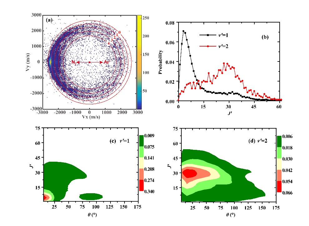 图 (a) 产物N2+散射图,(b) 理论计算的N2+不同振动能级的转动量子态分布以及N2+的v′ = 1 (c) 和v′ = 2 (d) 振动能级的转动激发与散射角的相关性图