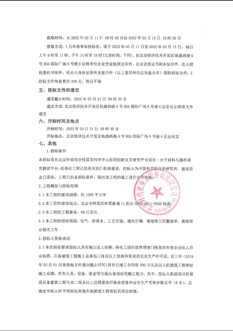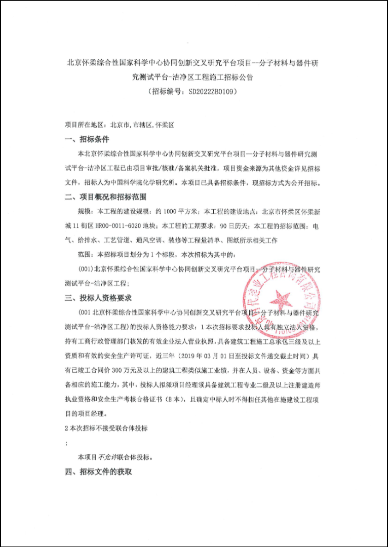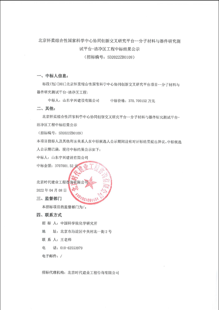 北京怀柔综合性国家科学中心协同创新交叉研究平台-分子材料与器件研究测试平台-洁净区施工(招标公告、中标公告)