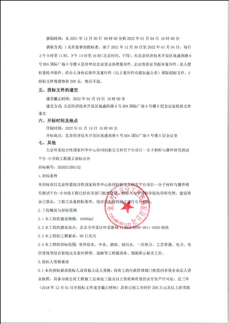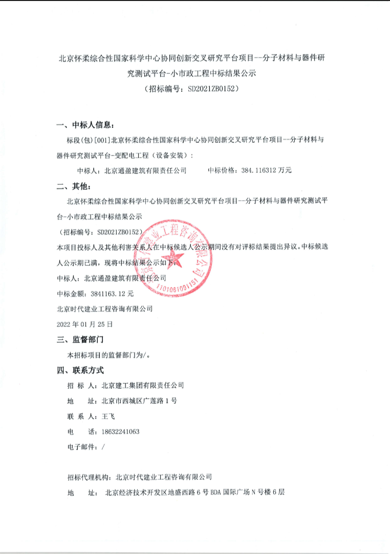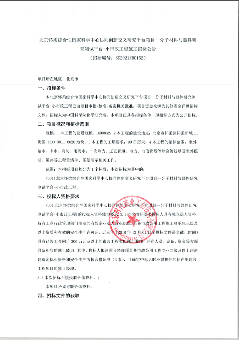 北京怀柔综合性国家科学中心协同创新交叉研究平台--分子材料与器件研究测试平台-小市政工程(招标公告、中标公告)