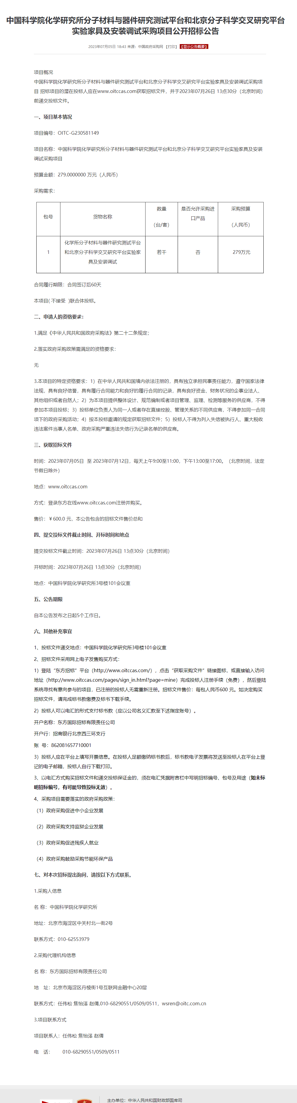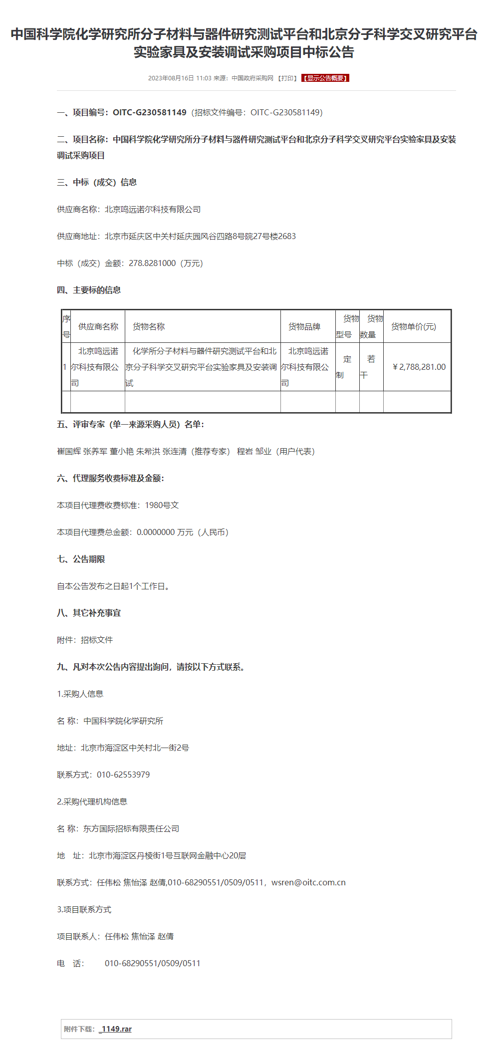 亚博888分子材料与器件研究测试平台和北京分子科学交叉研究平台实验家具及安装调试采购项目(招标公告、中标公告)