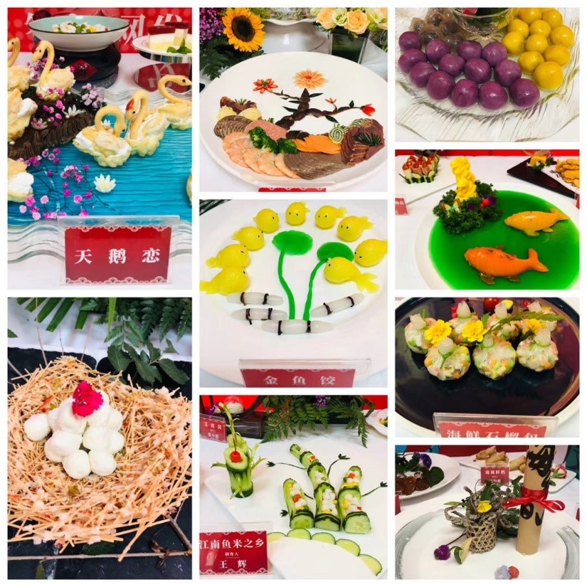 n 菜品观赏区,展台中央摆放着用西瓜雕刻中自百佳字样和精美的凤凰于飞琉璃饰品,两边是各式各样的创意名菜,有传统苏式名菜松鼠鱼、有以金色馒头为载、以寿司为核的金屋藏娇、有将中式烹饪艺术与西式时尚食材融会贯通的牛油果三文鱼,还有用红枣模拟车轮,用麦穗代表麦田的车轮红枣,精美的作品,引得大家阵阵的赞叹。