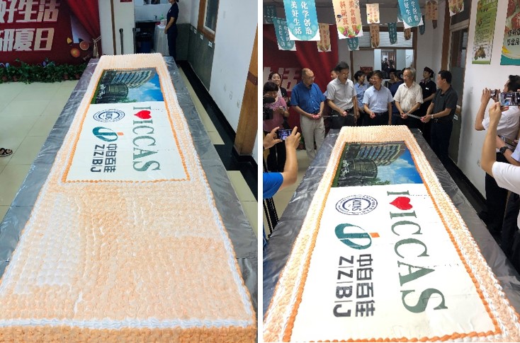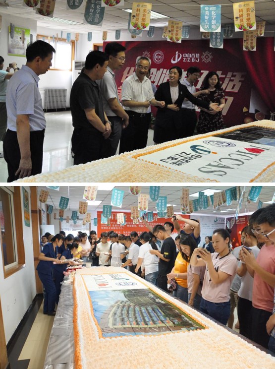 n 主题蛋糕分享区。惊艳的巨型蛋糕长5米、宽1.2米,“化学创造美好生活,美食燃爆科研夏日”16个大字紧扣主题;上面用奶油雕刻着化学所和中自百佳的logo,还有巨幅的化学元素表,I