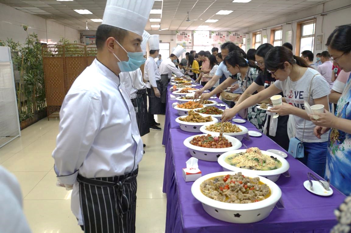 n 职工品尝区。美食品尝区位于餐厅入口,采用环形分散式布局,共分成热菜区、水果区、主食区、饮品区、风味小吃区五大区,外围以屏风和竹枝装饰,与对面的加工制作区遥相呼应。分别为热菜、凉菜、主食、小吃、饮品等近120个品种,师生们可以进行各类食品的品尝。