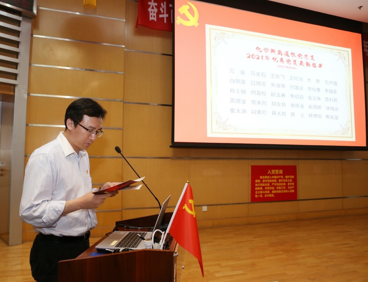 “光荣在党50年”纪念章颁发仪式在雄壮的国歌声中拉开了序幕。所长张德清首先宣读了化学所荣获“光荣在党50年”纪念章党员名单,化学所共有81位老党员获颁纪念章,其中年龄最大的朱起鹤先生97岁,党龄最长的孙彦斌老师入党时间长达74年。随后,与会所领导、所务委员、党委委员分别为到场的64位荣获纪念章的老党员一一佩戴纪念章并献花致敬。