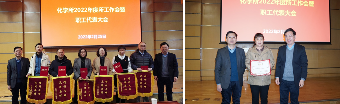会议颁奖环节,黄仁权宣读了《化学所关于表彰2021年度优秀职工的决定》和《化学所关于表彰2021年度优秀安全员的决定》。何圣贵副所长宣读了《化学所关于表彰2021年度BM先进集体、先进个人的决定》。范青华宣读了《化学所关于表彰2021年度优秀科研财务助理的决定》和《化学所党委关于表彰2021年度精神文明先进单位的决定》,并与张德清一并向荣获2021年度精神文明特别奖的离退休党支部颁发证书,向荣获2021年度化学所精神文明先进单位的化学热力学党支部、有机固体第二党支部、分子识别与功能党总支(含第一党支部、第二党支部)、绿色印刷第一党支部、高分子物理与化学党总支(含第一党支部、第二党支部)、分子动态与稳态党支部颁发精神文明先进单位流动红旗和荣誉证书。