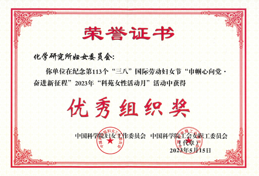 经评选,化学所妇委会荣获2023年“科苑女性活动月”优秀组织奖。